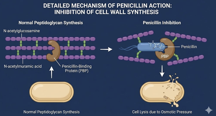 Penicillin-binding to the active site of transpeptidases prevents this cross-linking process by irreversibly inactivating the enzymes.