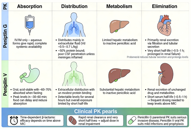 In summary, the pharmacokinetics of penicillin G and V are characterized by rapid absorption (for acid-stable forms), wide distribution, minimal metabolism, and rapid renal excretion, making them very effective in appropriate clinical settings.