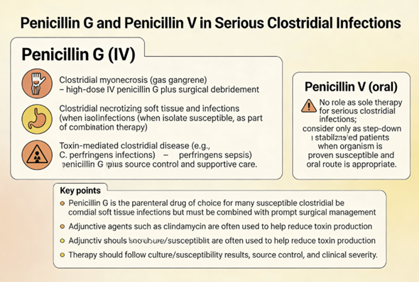 High-dose penicillin G along with surgical debridement is indicated for gas gangrene and Clostridium wound infections, as clostridial species (e.g. C. perfringens) are generally penicillin-susceptible.1