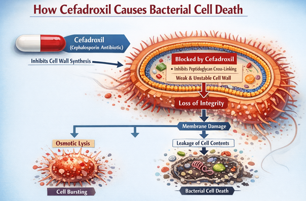 Failure of bacterial cell membrane as result of cefadroxil is the combination of both inhibition of cell wall synthesis and continuing autolysis. The cell wall, weakened by these processes, are insufficient to counteract the high internal osmotic pressure of the bacterial cytoplasm, resulting in cell lysis and bacterial death.