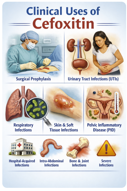 Cefoxitin is used primarily for infections where mixed aerobic–anaerobic flora from the gastrointestinal or genital tract are implicated, taking advantage of its anaerobic and Enterobacterales coverage in a single drug.19