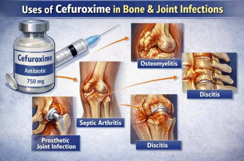 Cefuroxime may be appropriate for infections of bones and joints caused by susceptible organisms, primarily MSSA.