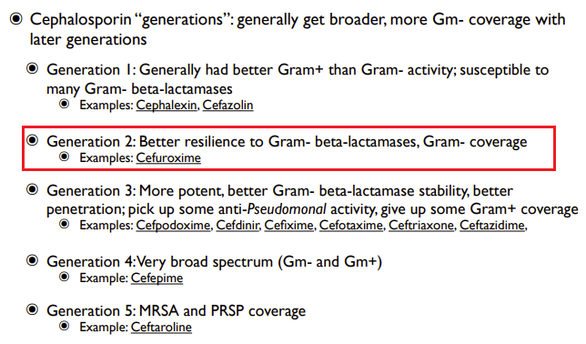 For example, cefuroxime would be appropriate for sepsis arising from a community-acquired pneumonia, for example, but would not be adequate for Pseudomonas sepsis.