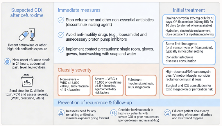 Management requires prompt discontinuation of cefuroxime, assessment of disease severity, and initiation of anti-C. difficile therapy with oral vancomycin or fidaxomicin.