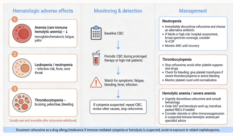 Reports of cefuroxime-associated hematologic abnormalities include decreased hemoglobin or hematocrit, eosinophilia, and prolonged prothrombin time.