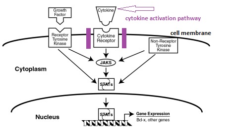 Highlighted is the pathway mediated by cytokines via the cytokine receptor and JAK (Janus kinase, a tyrosine kinase). 23
