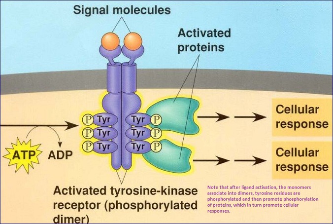 Active Form of Tyrosine Kinase: Notice that binding of the "signal molecules" favors monomeric association, phosphorylation of the enzyme tyrosine residues and phosphoryl group transfer to now associated proteins Cellular responses then ensue.22 Another kinase class in which the amino acid serine is central in phosphoryl-group transfer is the serine kinases.
