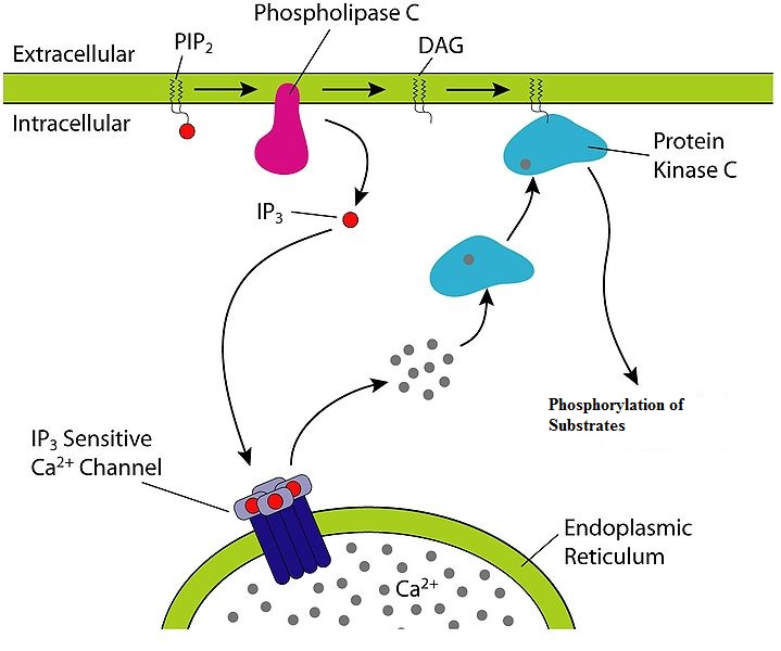 Increases in IP3 concentration promotes release of Ca2+ from intracellular sites thus increasing cytoplasmic free Ca2+.