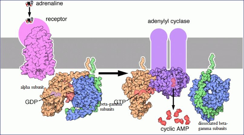 Following receptor activation by epinephrine (adrenaline), GDP dissociates and is replaced by GTP which results in activation of the GTP-αs -adenylyl cyclase complex which exhibits increased adenylyl cyclase activity. This increase in enzyme activity causes an increase in intracellular cAMP concentration. Also note that the βγ subunit has dissociated from αs. The αsβγ structure is reestablished following GTP hydrolysis.