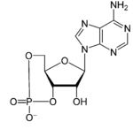 Considering cAMP, one enzyme that regulates cAMP levels is adenylyl cyclase, the activity of which is regulated by interaction with a G protein system. cAMP is formed by conversion of ATP to cAMP through a reaction catalyzed by adenylyl cyclase.