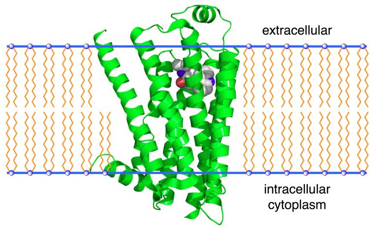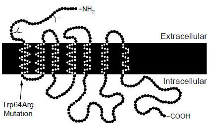 β3-Adrenergic Receptor Protein Diagram47 Each amino acid is shown as a circle. The substitution of a tryptophan by arginine (due to a missense mutation) is illustrated at the beginning of the first intracellular loop.47 In those subjects homogeneous for this mutation the onset of NIDDM was occurred at an earlier age.47