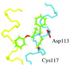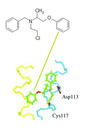 This cysteine (at position 117) appears important in the association of phenoxybenzamine with receptor with PB likely covalently coupled to this amino acid. (see model above)