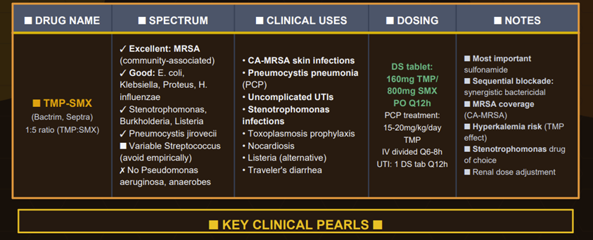 TMP-SMX is a broad-spectrum, bactericidal combination used for both