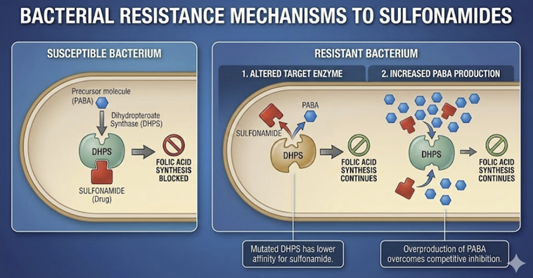 Decreased permeability or active efflux: Some bacteria reduce uptake of sulfonamide or increase efflux pumps to remove it, lowering the intracellular drug concentration.