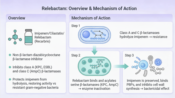 Relebactam’s mechanism of action is the same as that noted with avibactamin that it forms a reversible acyl-enzyme complex with serine beta-lactamases, inhibiting the enzyme without being permanently inactivated.1