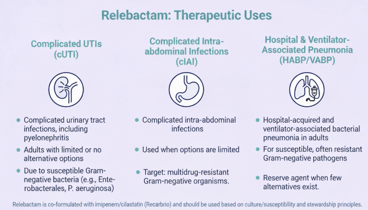 Relebactam is presently available as I combination product which includes imipenem and cilastatin, used to treat complicated urinary tract infections (UTI's), pyelonephritis, and complicated interabdominal infections in adults.2