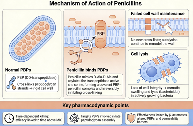 This mechanism selectively targets proliferating bacteria and explains penicillin’s synergy with aminoglycosides: inhibition of cell-wall synthesis allows aminoglycosides to better penetrate and reach their intracellular ribosomal targets.1