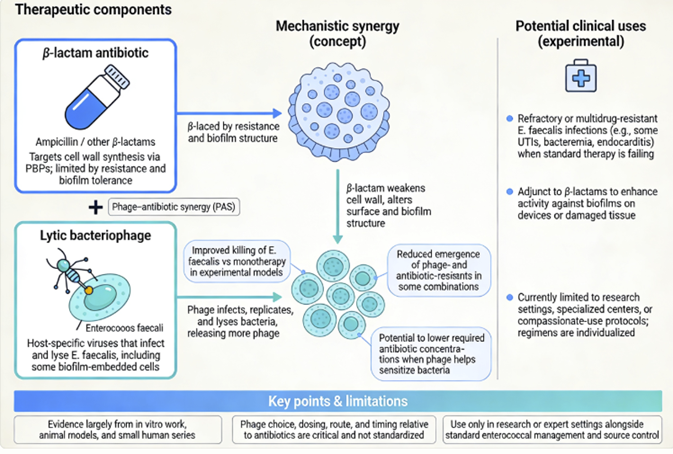 Effective treatment of Enterococcus faecalis infections has been demonstrated utilizing combination therapy involving bacteriophage (phage) and ß-lactam antibiotics. Further study is required before phage-antibiotic may become implemented clinically.6