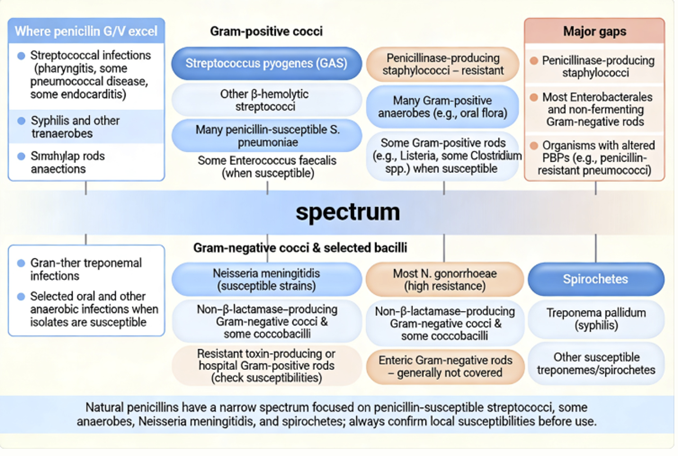 Penicillin G (benzylpenicillin) and Penicillin V (phenoxymethylpenicillin) are natural, first-generation penicillins with a relatively narrow antimicrobial spectrum focused primarily on Gram-positive organisms.2