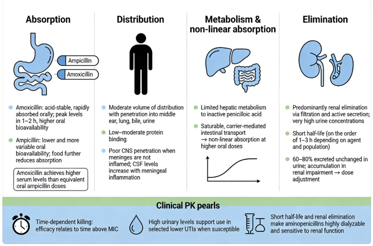 Because of this short half-life, dosing is typically frequent (e.g., every 6 hours for ampicillin, every 8–12 hours for amoxicillin) to maintain therapeutic levels.