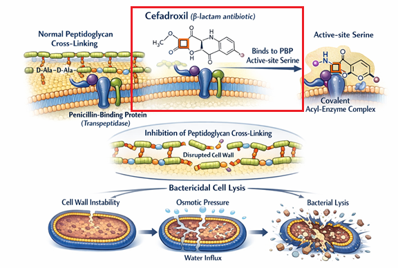 Cefadroxil, which functions as a structural analog of this natural D-alanyl-D-alanine substrate, possesses a high affinity for the PBP active site.12