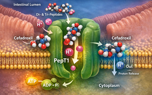 Cefadroxil, like other aminocephalosporins and aminopenicillins, is a substrate for the high-capacity, proton-coupled intestinal peptide transporter, PepT1 (SLC15A1).17,18