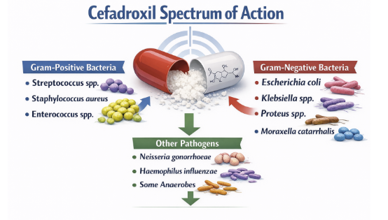 As a first-generation cephalosporin, cefadroxil's spectrum of activity is focuses on Gram-positive organisms but exhibits clinically useful activity against a select group of Gram-negative bacilli.5,6,7