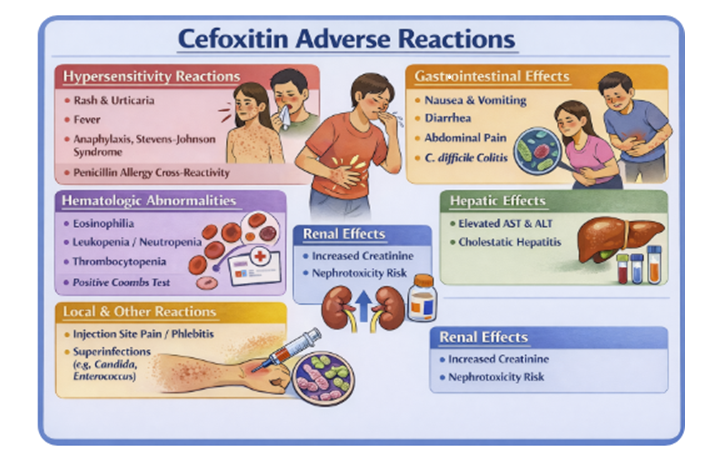Nephrotoxicity is uncommon when cefoxitin is used alone but may occur, especially when combined with other nephrotoxic agents (aminoglycosides, high‑dose diuretics), and accumulation with neurotoxic manifestations (seizures, encephalopathy) can occur in severe renal impairment if dosage is not adjusted.21,25,27