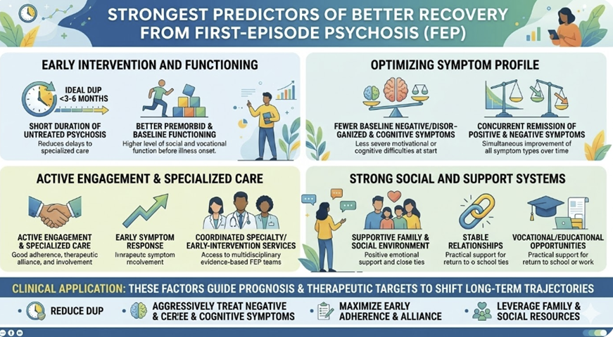 A large meta‑analysis of FEP found that shorter DUP independently predicted better functional recovery, even when sociodemographic and baseline clinical variables were controlled.1