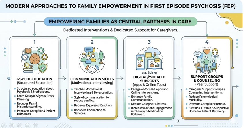 Family support is one of the most powerful determinants of outcome in first‑episode psychosis (FEP), because most patients are young, live with relatives, and depend on family for day‑to‑day care, treatment adherence, and crisis management.