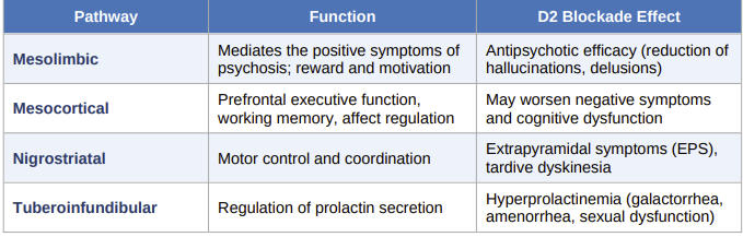 FGA blockade of D2 receptors in each of these pathways accounts for both the therapeutic effects and the adverse effect profile of this drug class: