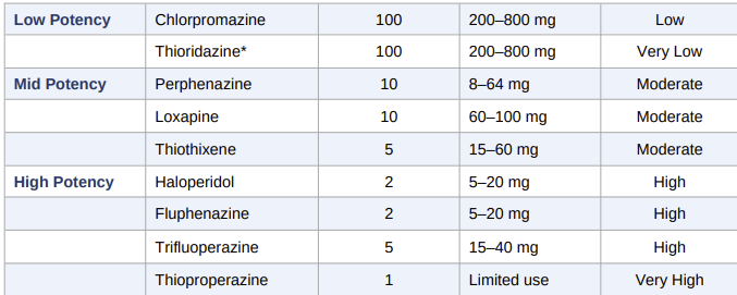 FGAs are classified by potency, defined by the milligram dose required to achieve an effect equivalent to 100 mg of chlorpromazine (the chlorpromazine equivalent, or CPZ-eq).