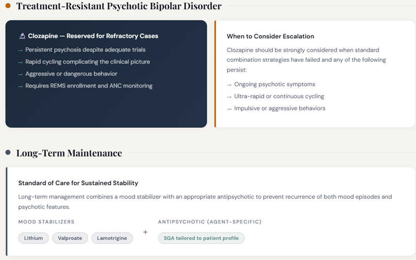 Clozapine should be considered for treatment-resistant psychotic bipolar disorder, particularly where rapid cycling, aggressive behavior, or persistent psychosis complicates the picture.