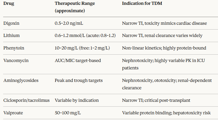 Therapeutic drug monitoring (TDM) is the practice of measuring drug concentrations in blood and adjusting doses to maintain concentrations within a defined therapeutic range.