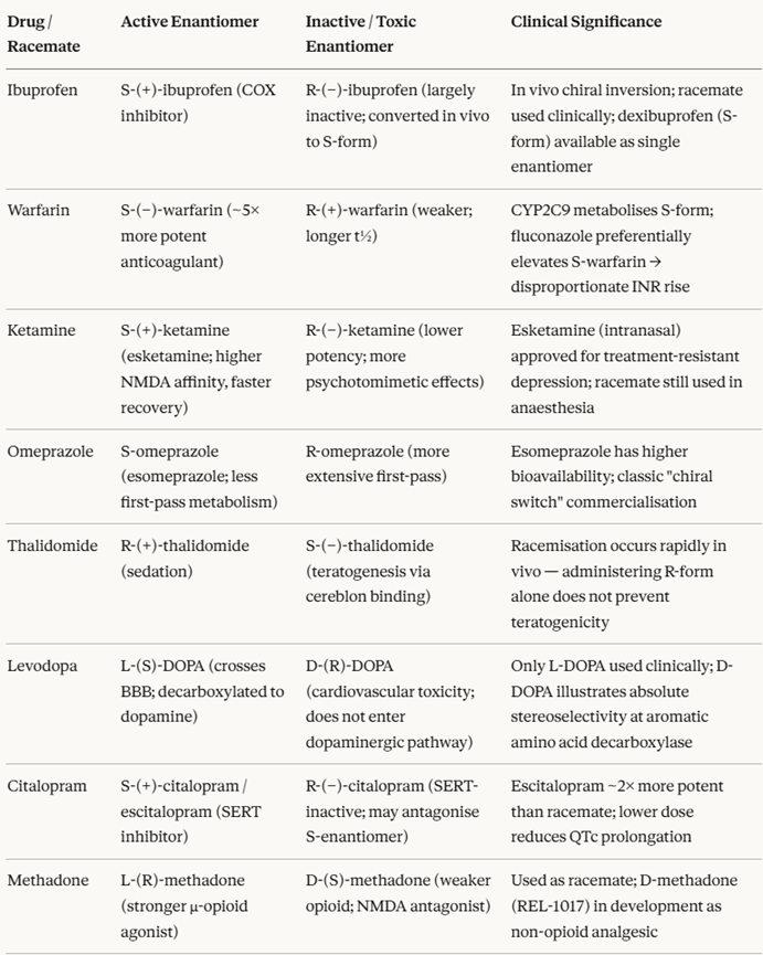 This is perhaps the most striking example of how a single stereocentre difference can produce drugs with entirely distinct indications, mechanisms, and adverse effect profiles.