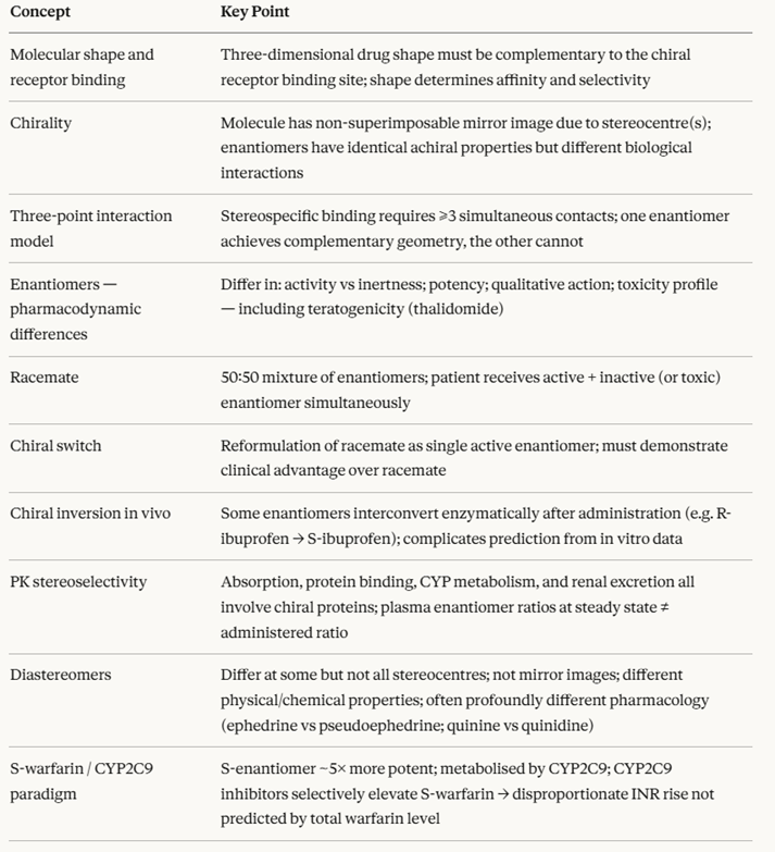 When a drug has a stereocentre, the two enantiomers can differ in pharmacology in four clinically important patterns.