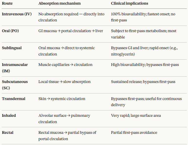 Route of administration is the single most important determinant of absorption. The major routes and their clinical implications are: