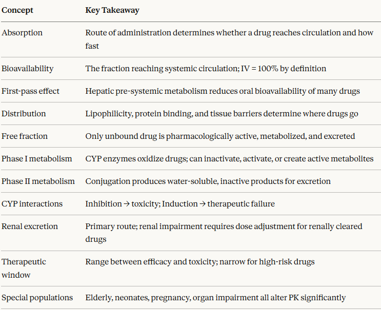 Understanding these processes conceptually is not optional background knowledge since it is the foundation for every dosing decision, every route-of-administration choice, and every anticipation of drug interactions.