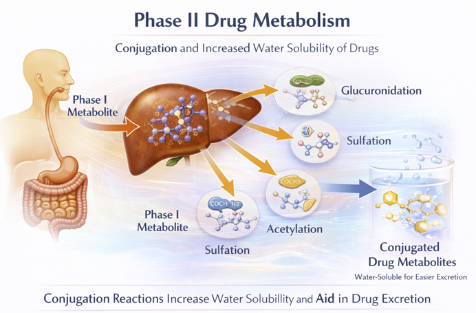 Phase II reactions conjugate the drug (or its Phase I metabolite) with an endogenous molecule such as glucuronic acid, sulfate, acetate, or glutathione, producing a highly water-soluble product that is pharmacologically inactive and readily excreted.8