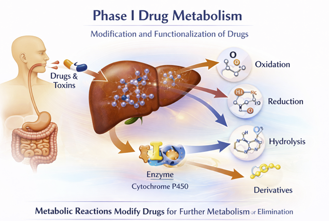 Phase I reactions introduce or expose a polar functional group on the drug molecule through oxidation, reduction, or hydrolysis.