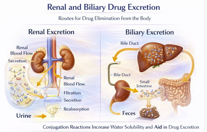 The clinical implication is direct: in patients with renal impairment, drugs that are primarily excreted unchanged by the kidneys accumulate.