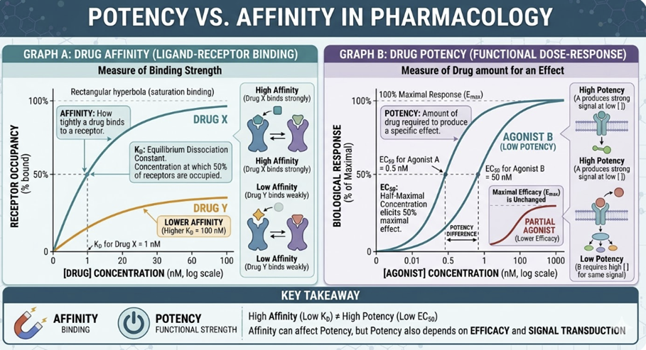 Affinity ,a binding property, quantified by Kd, is sometimes confused with potency, a functional property, quantified by EC50 which represents the drug concentration producing 50% of maximum effect.