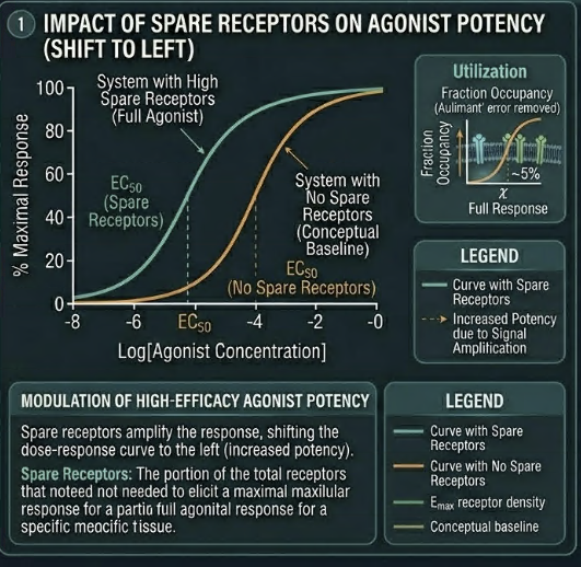 First, spare receptors amplify the apparent potency of high-efficacy agonists.