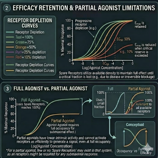 Second, spare receptors explain why drugs can maintain therapeutic efficacy even when receptor numbers are reduced by disease, desensitization, or pharmacological blockade, up to the point at which receptor reserve is exhausted. This has direct implications for tolerance to be discussed later.