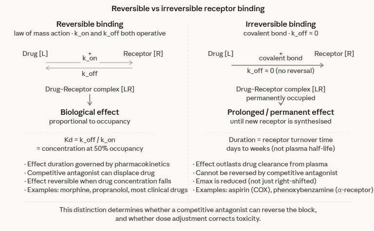 Irreversible binding occurs when a drug forms a covalent bond with its receptor, or when the dissociation rate constant (koff) is so low that the drug-receptor complex is effectively permanent on the timescale of clinical relevance. (The off rate (koff)) describes how slow or fast the drug dissociates from the receptor).