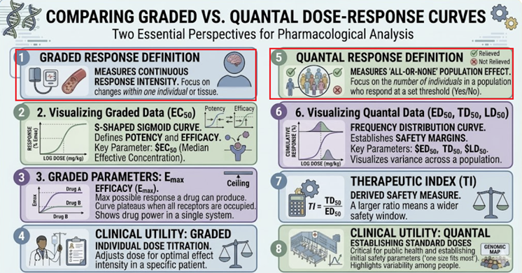 Graded dose-response curves describe how the magnitude of an effect changes with drug concentration in an individual.