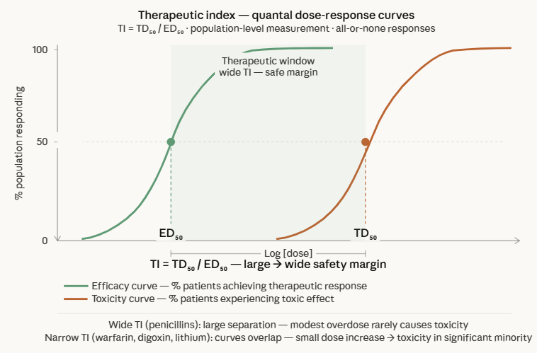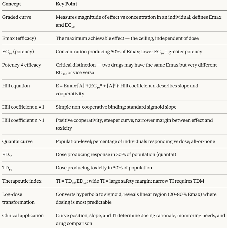 The Hill equation provides the mathematical backbone connecting them both. The therapeutic index translates all of this into a clinically actionable safety metric.