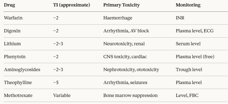 Narrow therapeutic index drugs in clinical practice require therapeutic drug monitoring, careful dose individualization, and close clinical surveillance.